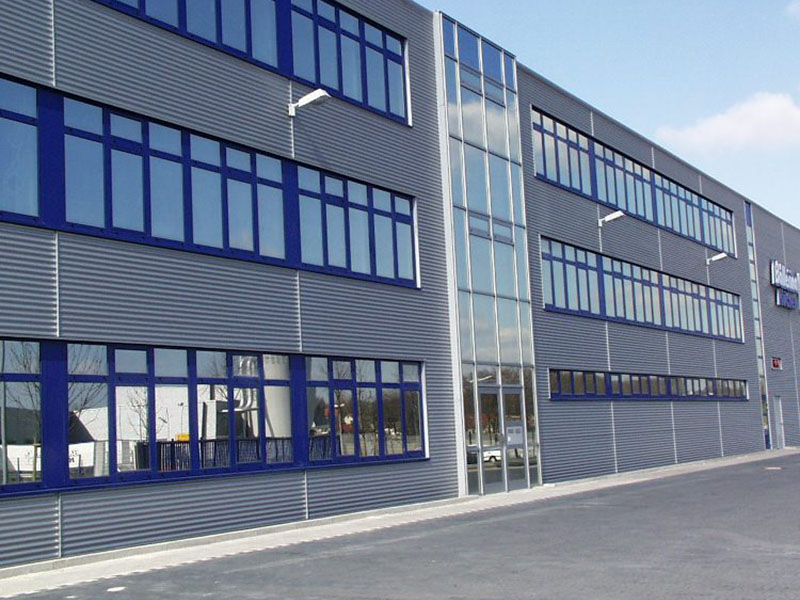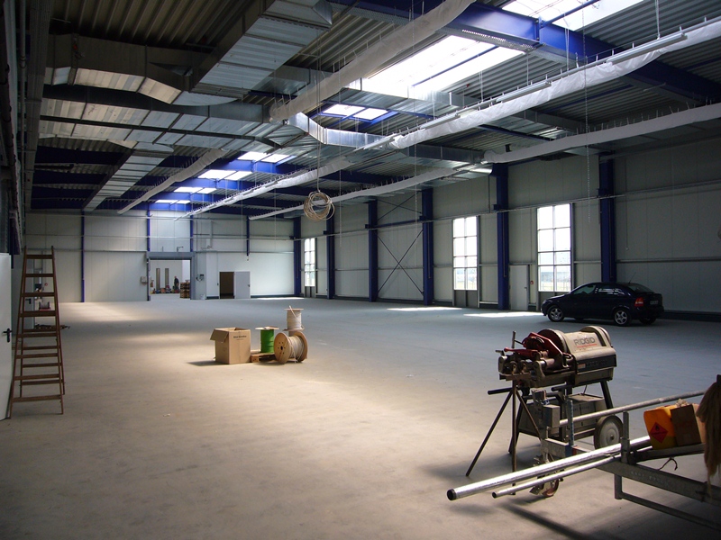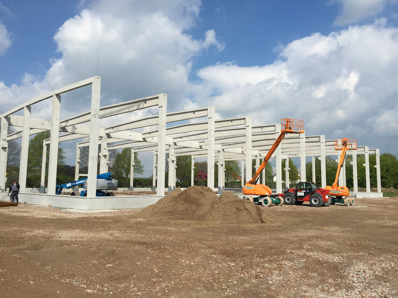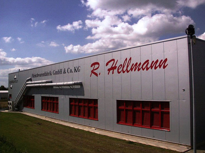 Die Firma Hellmann, Erzeuger westfälischer Rohwurst-Spezialitäten, beauftragte den Neubau des Logistikzentrums mit einer Verwaltungseinheit. In dieser neuen Betriebsstätte findet die Nachreifung von Wurstwaren nach EG-Richtlinien, deren Verpackung, Kommissionierung, so wie der Versand statt. „Das Firmengebäude in sachlich, zeitloser Architektur soll besonders wirtschaftlich zu unterhalten sein. Ab dem ersten Bauabschnitt sind alle Vorrichtungen für eine mögliche Werkserweiterung einzuplanen“, so der Auftraggeber. Da sich das Firmengebäude auf dem Gelände einer ehemaligen Militäranlage befindet, wies der Untergrund diverse Auffüllungen unterschiedlicher Güte auf. Deshalb wurde zunächst eine Bodenverbesserung durch eine Tiefergründung vorgenommen. Dann erfolgte der Neubau in vier Bauabschnitten. Die enge zeitliche Vernetzung mit den anderen Gewerken ermöglichte die schnelle Fertigstellung der qualitativ hochwertigen Rohbaukonstruktion. Mit den Betreibern fand fortlaufend eine Abstimmung statt, um etwaige Änderungswünsche direkt zu berücksichtigen. Die Übergabe des Objektes erfolgte termingerecht. Die Abnahme durch das Gesundheitsamt, das die Einhaltung der EG-Richtlinien prüft, verlief reibungslos. Die Wünsche der Bauherren nach einer günstigen Bauweise mit zukünftigen Erweiterungsoptionen wurden erfüllt. Dies spiegelt sich zu guter letzt in der optisch ansprechenden Außenfassade wider. Sie ist kostengünstig mit verzinkten Thermosandwichelementen verkleidet. In der Hausfarbe Rot bilden die farbigen PVC-Elemente zur grauen Grundfläche einen ansprechenden Kontrast.