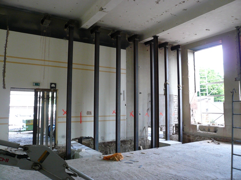 Die Otto-Hahn-Realschule in Herford bietet ein Ganztagsschulkonzept, darunter ein Mittagsangebot. Dazu zählt unter anderem die Möglichkeit, gemeinsam Mittag zu essen. Dafür beauftragte man den Umbau zur Schulmensa im bestehenden Gebäudekomplex der Realschule. Zunächst wurden aufwändige Abbruch- und Abfangungsarbeiten durchgeführt, um den Altbau mit dem vorgesetzten Gebäudeteil verbinden zu können. Hier war große Sorgfalt gefragt, da die Arbeiten bei laufendem Schulbetrieb umgesetzt werden mussten. Im ersten Arbeitsschritt wurde das Altfundament aus Bruchstein abschnittsweise freilegt, um direkt daneben neue Fundamente für die Abfangkonstruktion zu schaffen. Im nächsten Arbeitsgang wurden zwanzig Stahlstützen aufgestellt, um die Lasten abzufangen. Daraufhin konnte das Fundament für die endgültige Stahlkonstruktion gegossen werden. Anschließend wurde die siebzig Zentimeter dicke Altwand großzügig geöffnet. Direkt darüber befanden sich drei weiter genutzte Etagen, unter anderem das Lehrerzimmer Im weiteren Verlauf wurden zwei Rundstützen mit einem Durchmesser von 273 Millimetern und zwei verbolzte Stahlträger HEB 450 eingebaut, um die Tragfähigkeit im endgültigen Bauzustand zu gewährleisten. Diese komplexe Aufgabenstellung erforderte maßgenaues Arbeiten zwischen den dicht gestaffelten Stahlstützen, die den Bewegungsfreiraum einengten. Mit gekonnter Geschicklichkeit wurde der Auftrag erfolgreich und termingerecht zum Abschluss gebracht.
